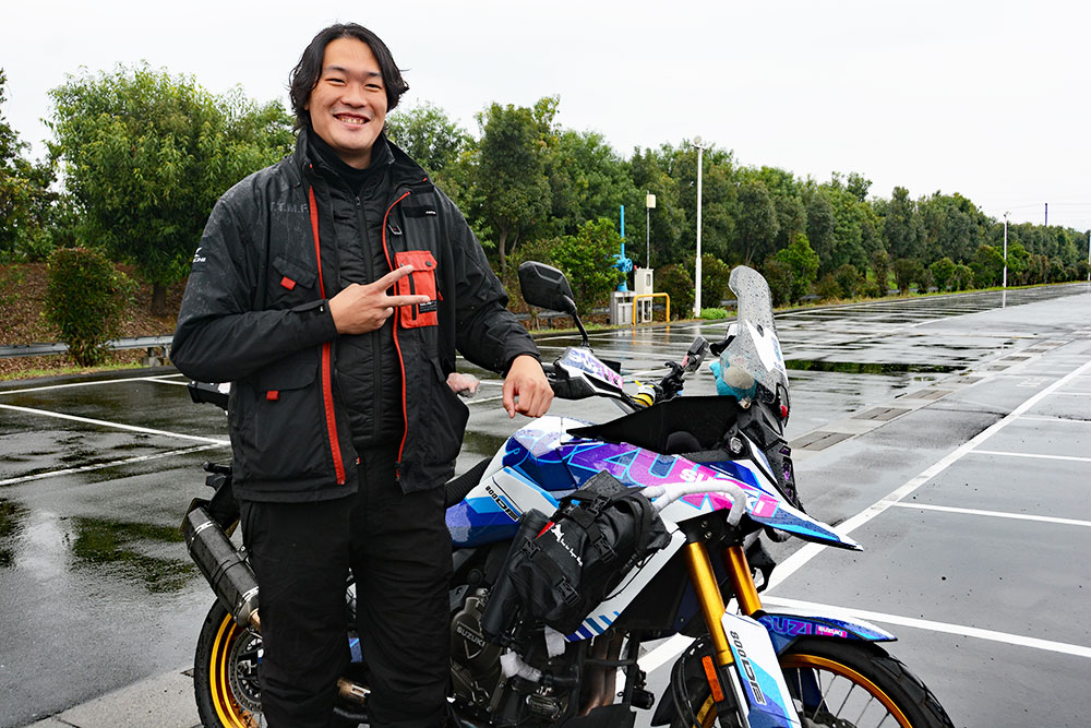 「このイベントはVストロームのオープンチャットで知って、興味があったので友達の伊福くん(後述)を誘って一緒に来ました。一番の目的は、他の人のVストロームがどんなカスタムをしているのか見ることですね。以前はカワサキ『Z900RS』に乗っていたのですが、身長200cmの僕には小さくて、それでシート高の高い車両を探して、見つけたのがVストローム800DEでした。大きさもちょうど良くて、一目惚れでしたね。今は街乗りからツーリングまでフル活用しています」