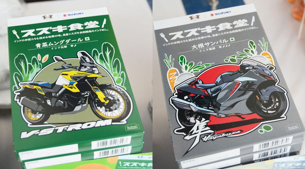 各種製品のパッケージはスズキのデザイナーによるオリジナルデザインで、スズキの人気4機種が描かれた「二輪スペシャルパッケージ」(上の写真)はスズキが開催する二輪車の各ユーザーミーティングを記念して発売されました。お味は、レンズ豆とトマトを用いた北インドの煮込み料理「トマトレンズダール」です。