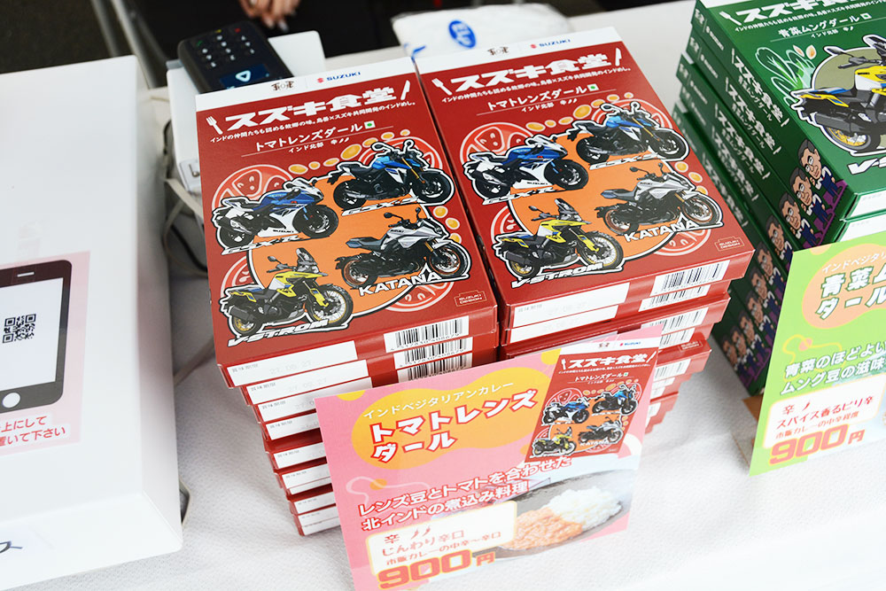 「スズキビジネス」と名付けられたブースでは、スズキ公式のフードブランド「スズキ食堂」のレトルトカレーが販売されていました。スズキに勤務するインド人従業員や研修生のために生み出されたもので、一般的なレトルトカレーには宗教上の理由により食べられない食材が用いられていることから、ベジタブルカレーとして手がけられました。