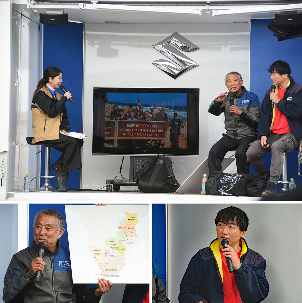 午後の部では、冒険家の賀曽利 隆氏(以下、賀曽利氏)とツーリングマップルの編集長を務める舛木 信太郎氏(以下、舛木氏)がステージに登壇。イベント前日に帰国したばかりという賀曽利氏から、体験したばかりのアフリカ大陸縦断ツーリングについて語られました。