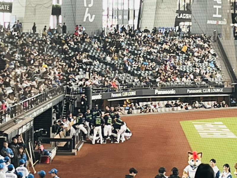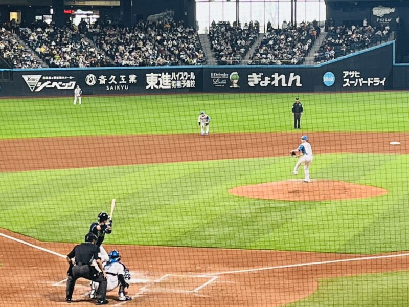 初のエスコンバックネット裏観戦。ピッチャーの球がキャッチャーミットにおさまる爽快な音が臨場感たっぷり。選手みんなの動きもよく見える、野球好き民にはたまりませぬ。