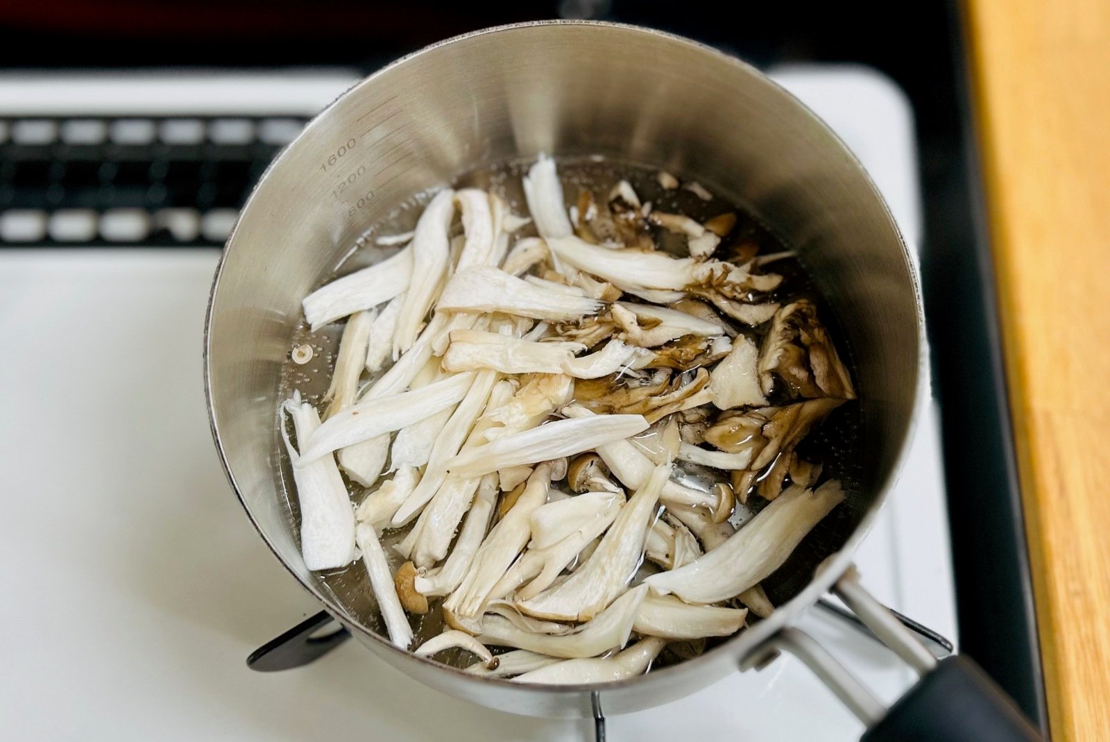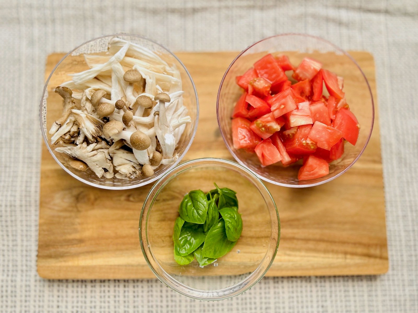 1. きのこは手でほぐし、トマトは2cm角にカットする。