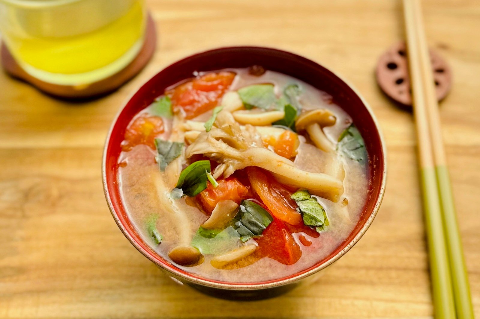 まだ夏の暑さが残りつつも、少しずつ秋の気配が近づいてくる季節。体のだるさや食欲の落ち込み、気温差による不調が出やすい時期でもあります。そんなときにぴったりなのが、トマトの爽やかな酸味と、きのこの旨味を合わせたみそ汁です。甘みや酸味、うま味が重なった一杯は、体を内側からやさしく整えながら、夏の疲れを和らげてくれます。