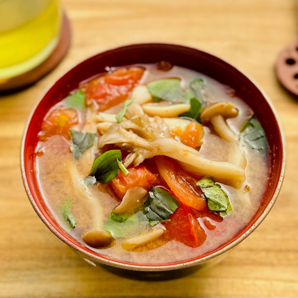 数種類のきのことトマトを煮ることで、複雑なうま味とコクがありながらもさっぱりとしたみそ汁に仕上がります。仕上げにはバジルとごま油を加え、香りとまとまりをプラスしましょう。