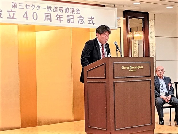 三セク協会長は愛知環状鉄道の金田学社長。記念式典で、「三セク各社は、それぞれの地域で公共交通機関としての重要な役割を受け持つ。今後も経営改善を目指して努力するので、関係の皆さまの支援・協力をお願いしたい」とアピールしました。