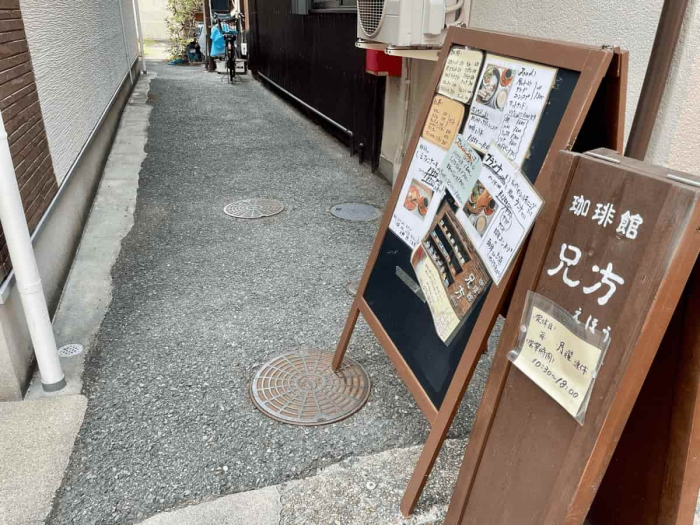 垂水駅近くの商店街から、小道を入った場所に見つけた看板『珈琲館 兄方(えほう)』。気になって調べてみるも、情報がほとんど出てきません。看板の奥には、さらに細い道が続いています。