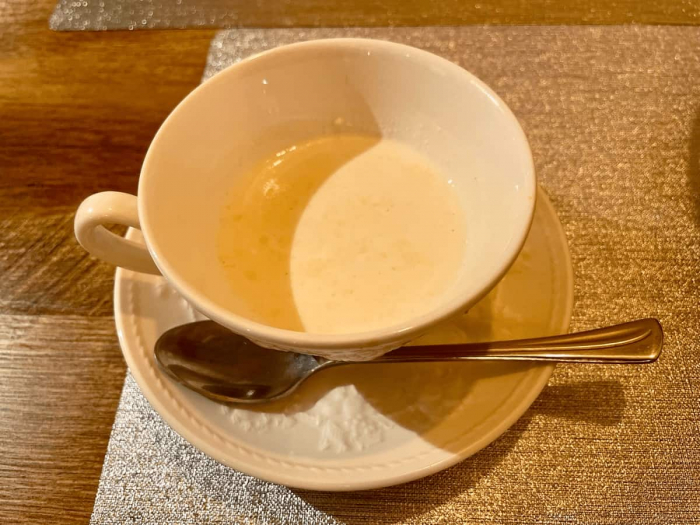 毎朝手作りするというコーンスープは、コーンの自然な甘みにほっこり。生クリームを加えることでコクを出しているのだそうです。
