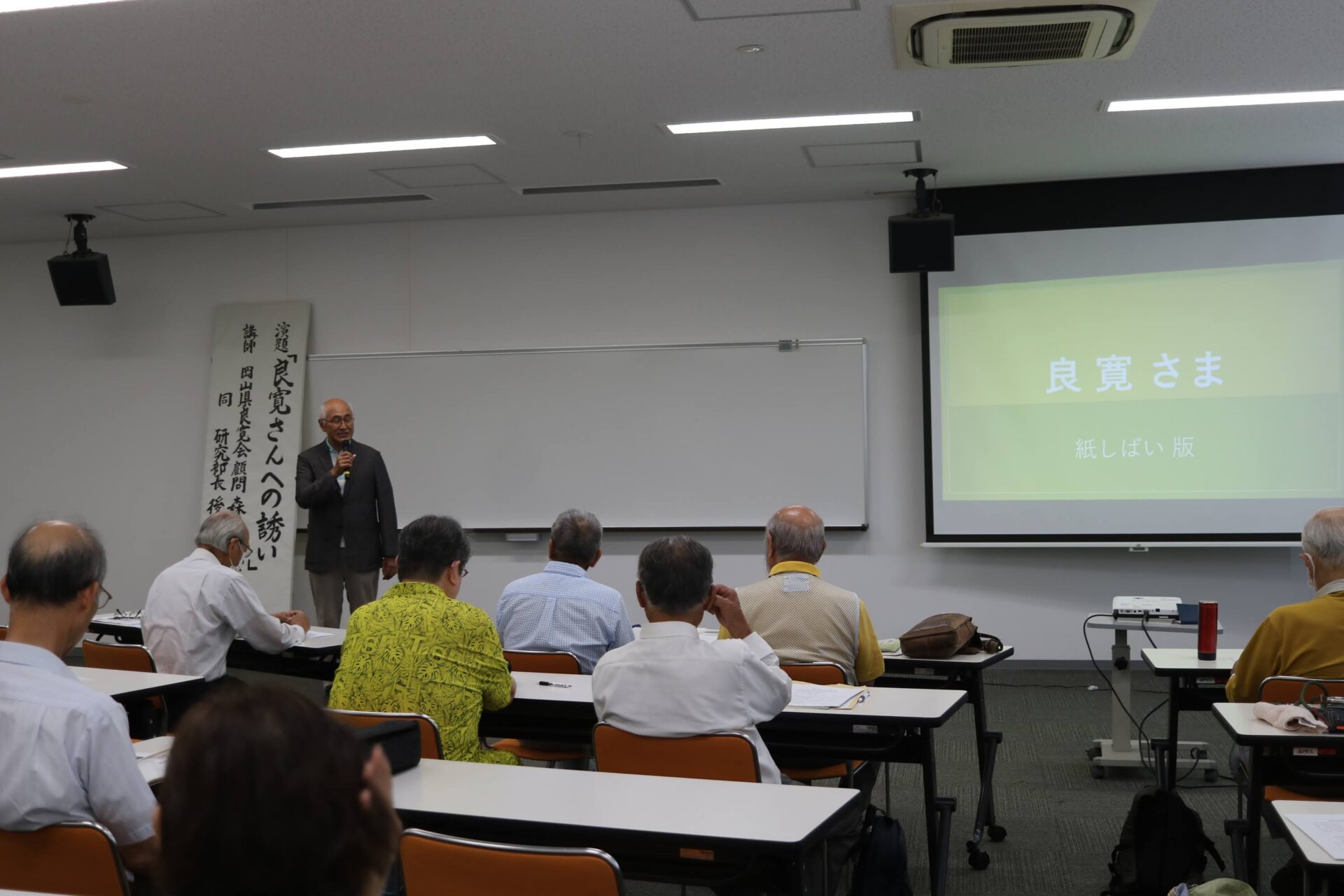 岡山県良寛会会長の菊池東(きくち とう)さんのあいさつに始まり、紙芝居、動画視聴、講義と続く、充実した1時間30分でした。