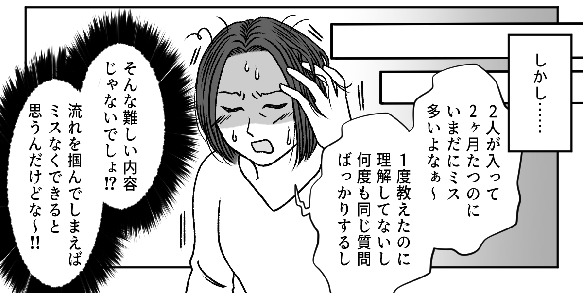 入って2ヶ月たちますが、ミサキさんとクミさんはいまだにミスが多く、1度教えたことでも理解していません。それに何度も同じところで質問をしてきます。商品も多くやることが重なるときもあるのですが、作業的にはそんなに難しい内容ではないはずなのに、です。
