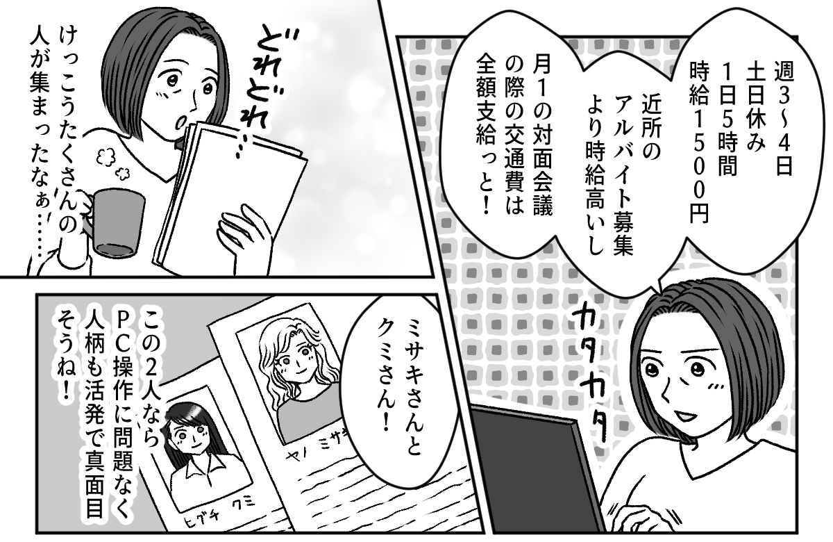 私の名前はエナコ。個人事業主として、服飾雑貨を大手ネットショッピングサイトに掲載する仕事をしています。在宅でPC作業をしながらずっとひとりでやってきましたが、仕事量も発注も増えたため人手を増やそうと思い、このたび思いきってアシスタントを2人雇うことにしました。この地域では高いほうの時給で募集をかけたので、たくさんの人が集まってくれました。そのなかから印象のよかった2人を雇うことにしたのですが……。