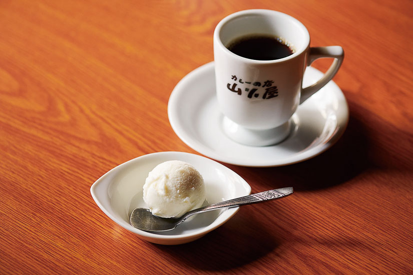 カレーメニューを注文するとついてくるヨーグルトアイスは、創業時から変わらない味わい。「コーヒー」(550円)は伊那市の「KAICOFFEE」の豆を使用しています。