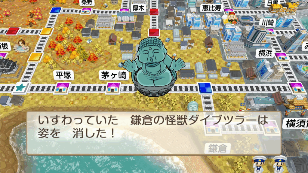 変身した危険なボンビーがついている状態などで目的地への通行を妨害されてしまうと一気に最下位に転落してしまう恐れがあるため、鎌倉付近ではなるべく一発でゴールを狙いましょう。