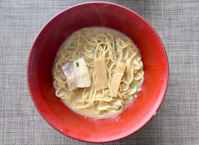 そして手順に従い、待つこと10分ほどで出来上がったのがコレ。焼豚とネギはそこまで多く入っていないな〜と思ったものだが、値段を考えたらこれくらいが妥当だろう。