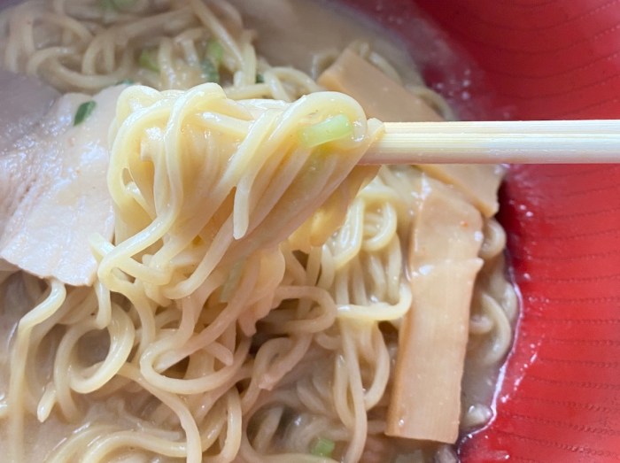 麺の方は細ストレートの柔らかめでやや冷食感あり。とはいえ、歯応えの主張はそんなになくスープとの絡みも浅めだから全体的に食べやすい印象を受けた。