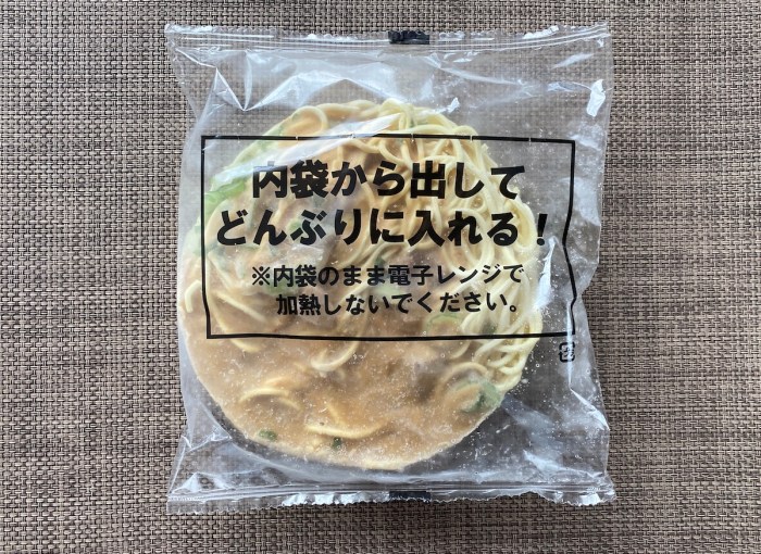 やり方としては内袋から出してどんぶりに入れ、そこに水、または熱湯を200ml注ぐ。それからレンジに放り込んで加熱するだけ(ラップ不要)でOKとのこと。