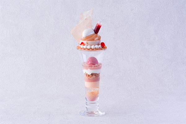 桃のパフェは貴婦人の帽子をイメージしたデコレーションで見た目も楽しめる逸品。