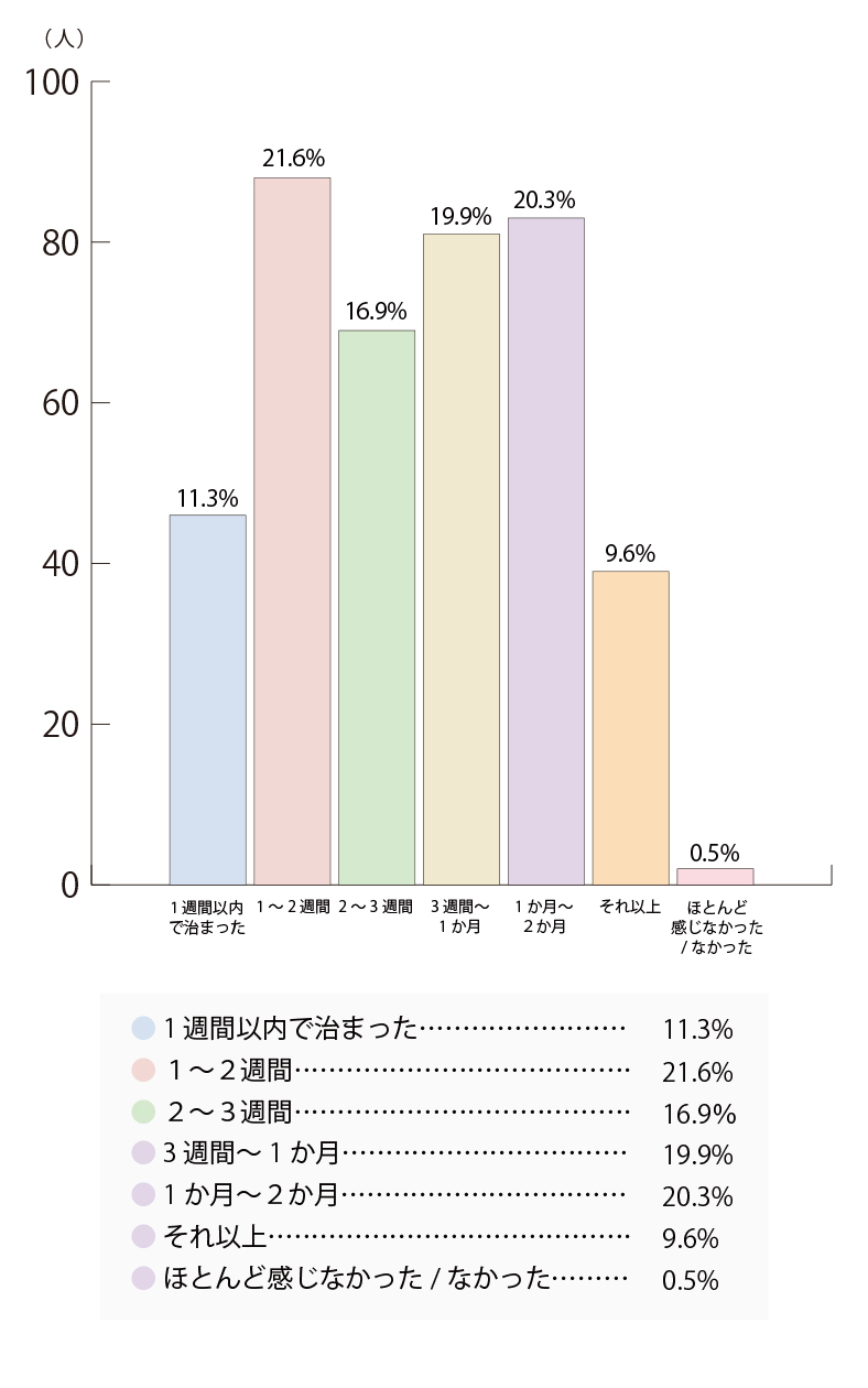 アンケートでお聞きした会陰切開や帝王切開の傷の痛み、後陣痛は「生理痛より少しひどい痛み」を基準として、それ以上の痛みがあるケースについてお答えいただいています。そのうえで約4割の方が悩んだという「産後の痛み」は、一体いつまで続いたのでしょうか。
