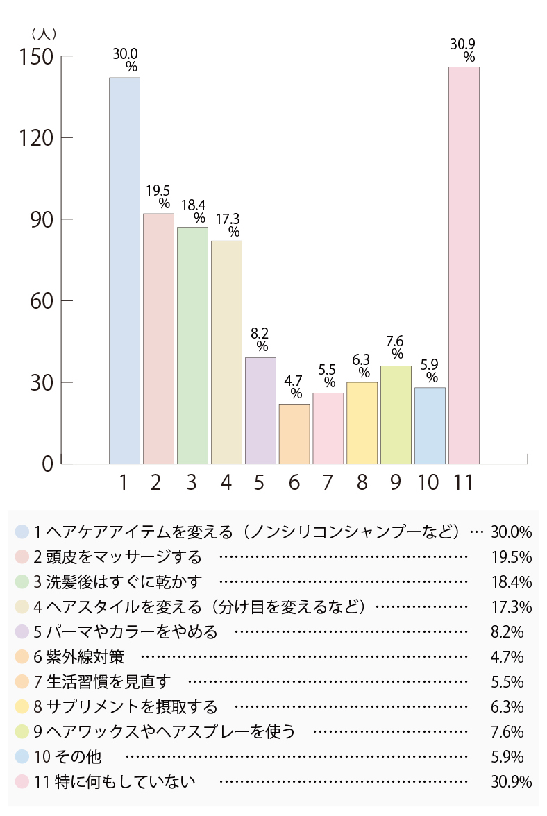 最も多かった回答は「特に何もしていない」で30.9%。次いで「ヘアケアアイテムを変える(ノンシリコンシャンプーなど)」が30.0%でした。対策をした方に効果があったかを聞いたところ、「あまり効果は感じられなかった」が44.0%と最も多く、「やや効果があると感じた」(35.8%) を上回る結果となりました。