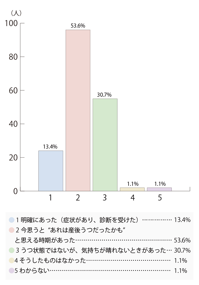 一方、診断を受けたわけではないけれども、「今思うと“あれは産後うつだったかも”と思える時期があった」と回答されたのは53.6%。「明確にあった」とあわせると、実に67%ものママがこころの不調を経験しているということになります。