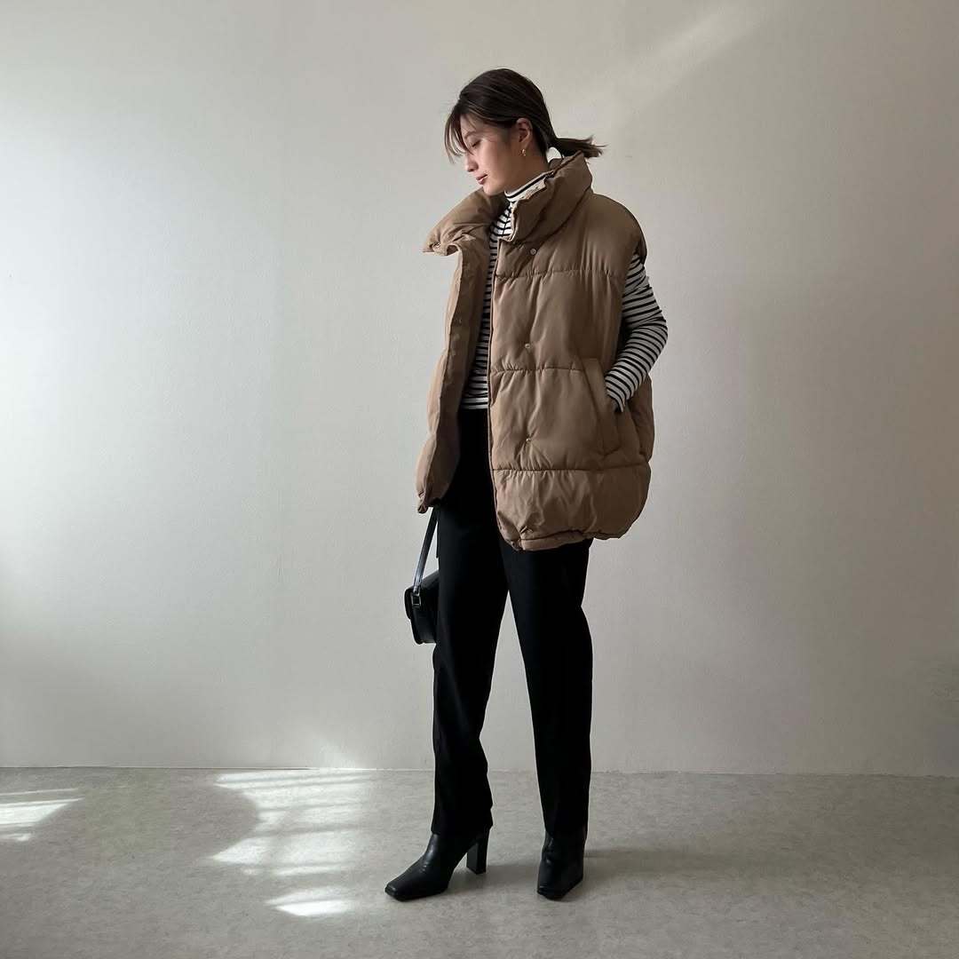 ダウンベストはボリュームが大きいアイテムなので、中に着るトップスやボトムスはスリムなものを選ぶとバランスが取りやすくてGOOD。