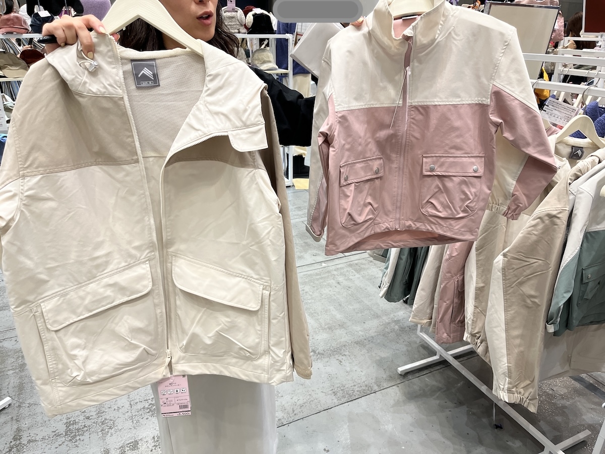 ワークマンで発売中の「撥水ペアマウンテンパーカー」(税込3500円。サイズはM〜LL)と「撥水ペアマウンテンパーカー Kids」(税込2500円。サイズは120cm〜140cm)。カラー展開はオフ×ベージュ、ピンク×オフ、ミント×グレージュとどちらも同じなので、親子コーデができる可愛いアウターです。