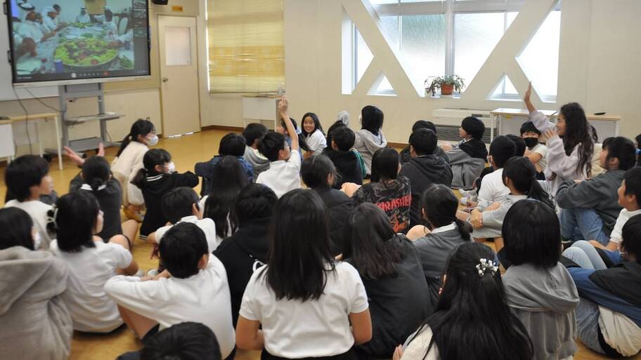 中津第二小学校では、昨年まで菊池教諭の教え子だった5年生57人が参加。画面に菊池教諭が映ると歓声を上げながら手を振り、楽しそうにクイズに挑戦していた。菊池教諭は、ドーハ日本人学校で実施している「砂漠に花を咲かせようプロジェクト」についてもふれ、現地の児童と一緒にクラウドファンディングを行っていることなどを説明していた。