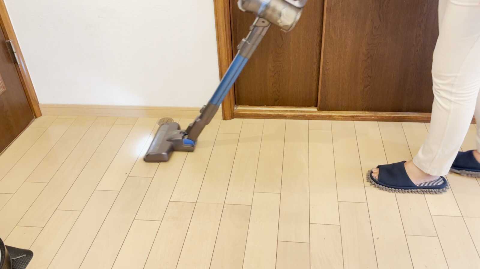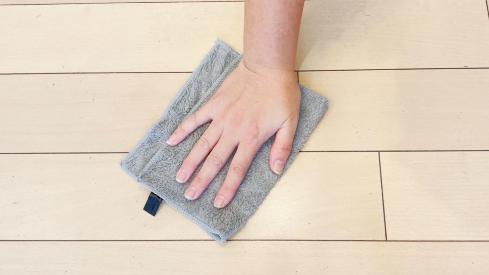部屋の奥から手前に向かってクロスをすべらせていきます。普段は気づきにくい汚れやベタつきも、直に拭くことでしっかり取り除けます。クロスを動かしながら床の感触を確かめると、「こんなに汚れていたんだ」と実感でき、拭き終えたあとは床も気持ちも軽やかになります。