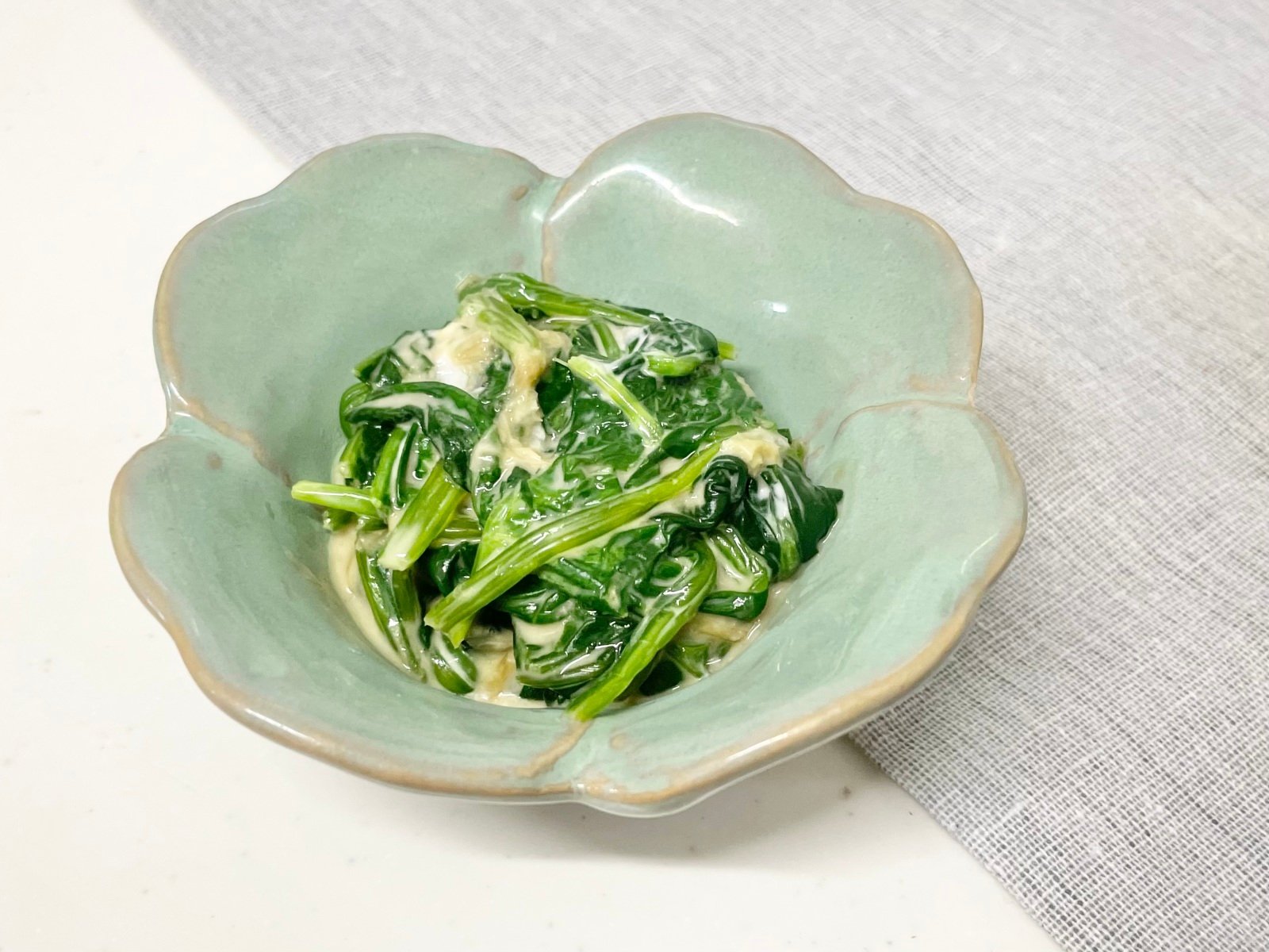 ほうれん草を電子レンジで加熱したら和えるだけ。