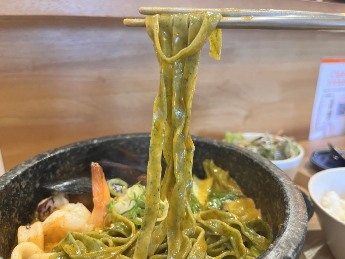 そして、海鮮と同じくらい存在感を放つのが、見た目にも鮮やかな緑色の麺!使われる麺は『淡路麺業』のもので、ほうれん草を練り込んだ特製生麺なんだそう。濃厚なピリ辛クリームスープとの相性は抜群で、最後までモチモチの食感が楽しめます。
