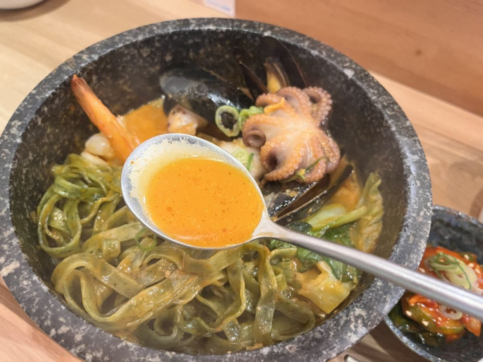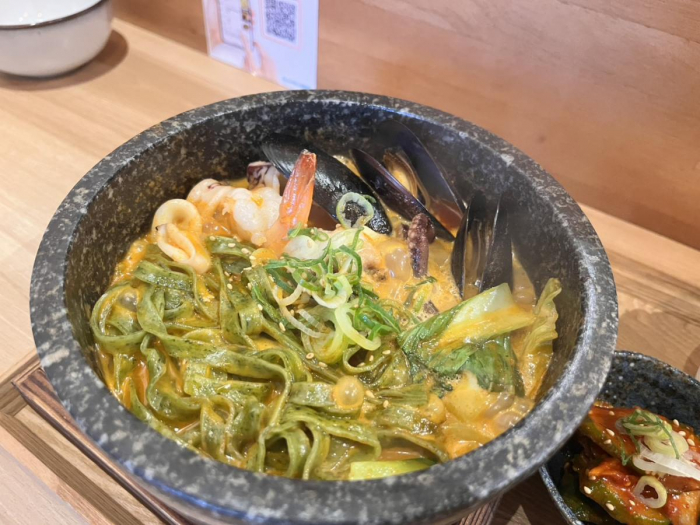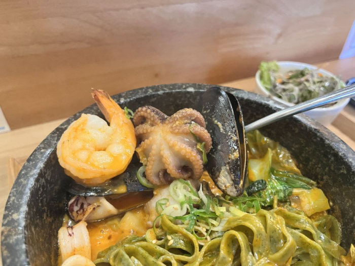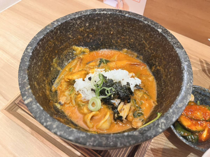 スープはピリ辛で、海鮮の旨みがぎゅっと凝縮された濃厚な味わい。海鮮から染み出した出汁がクリーミーなスープと混ざり合い、まろやかさの中にしっかりとしたコクを感じます。