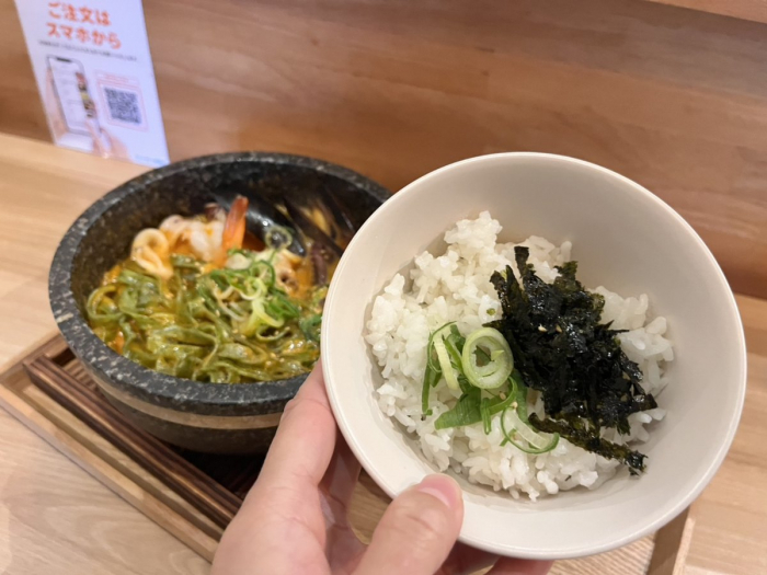 そして、麺を食べ終わってからのお楽しみが“〆のリゾット”。ここで、セットについていたごはんの出番です。