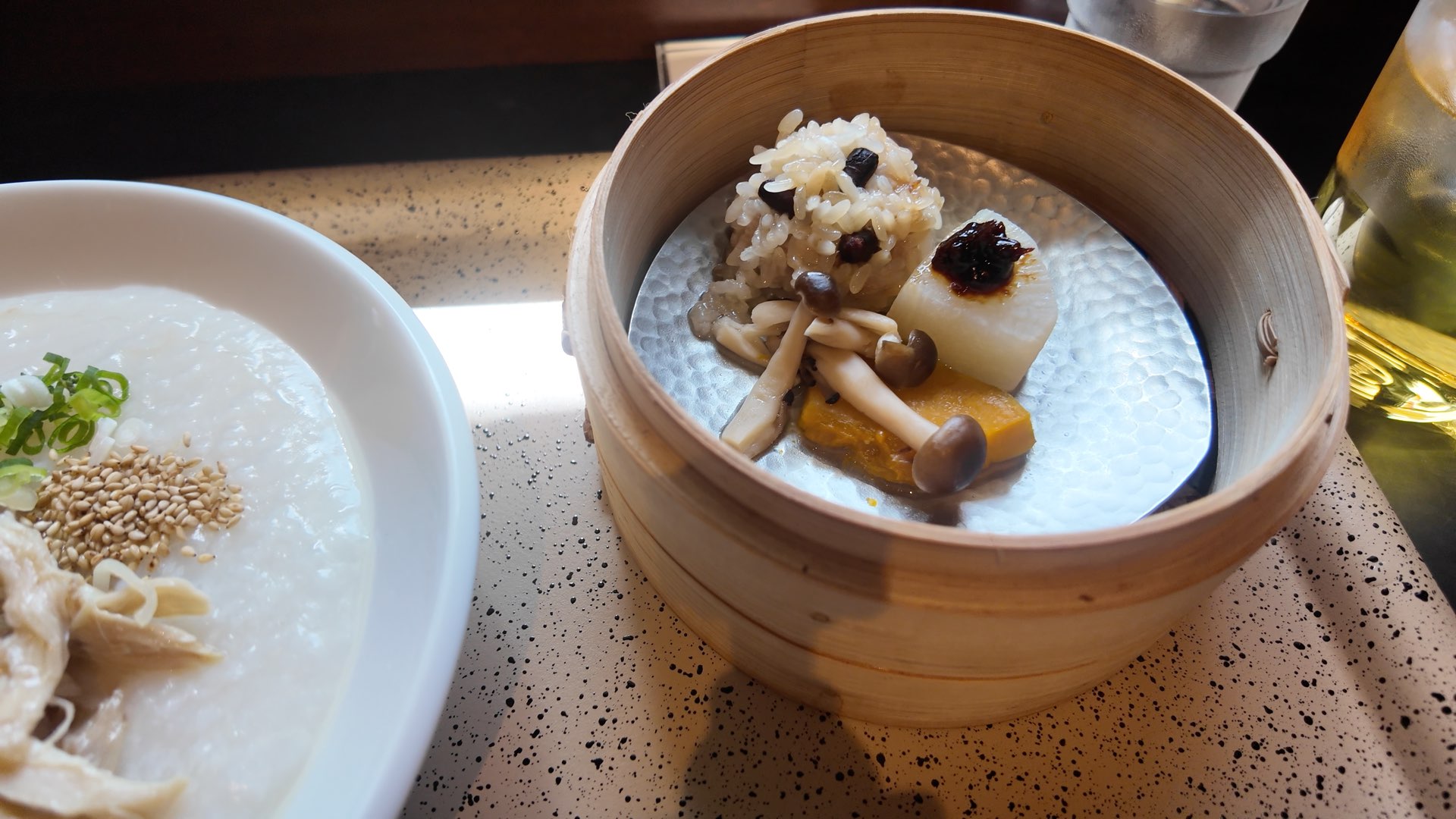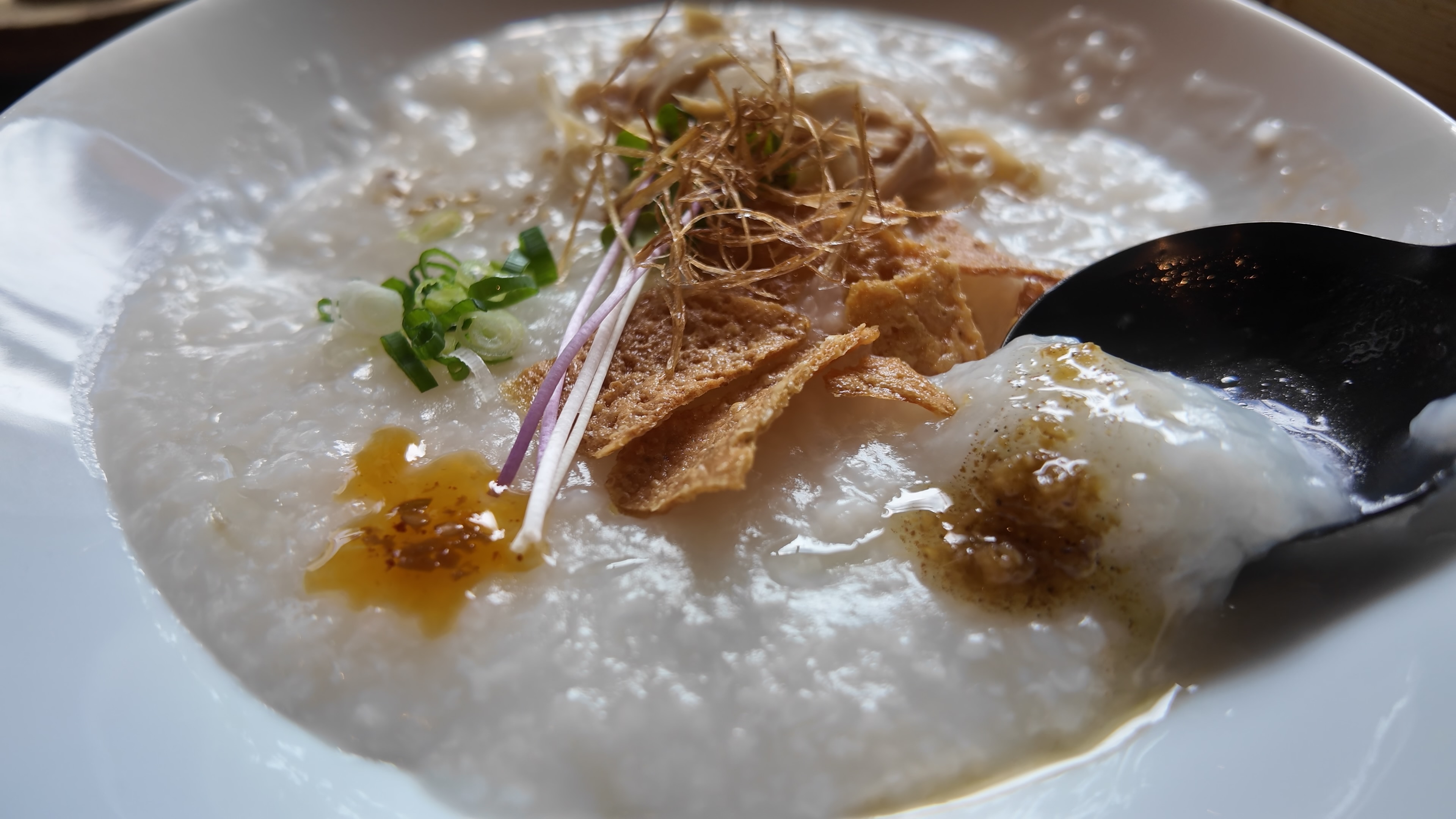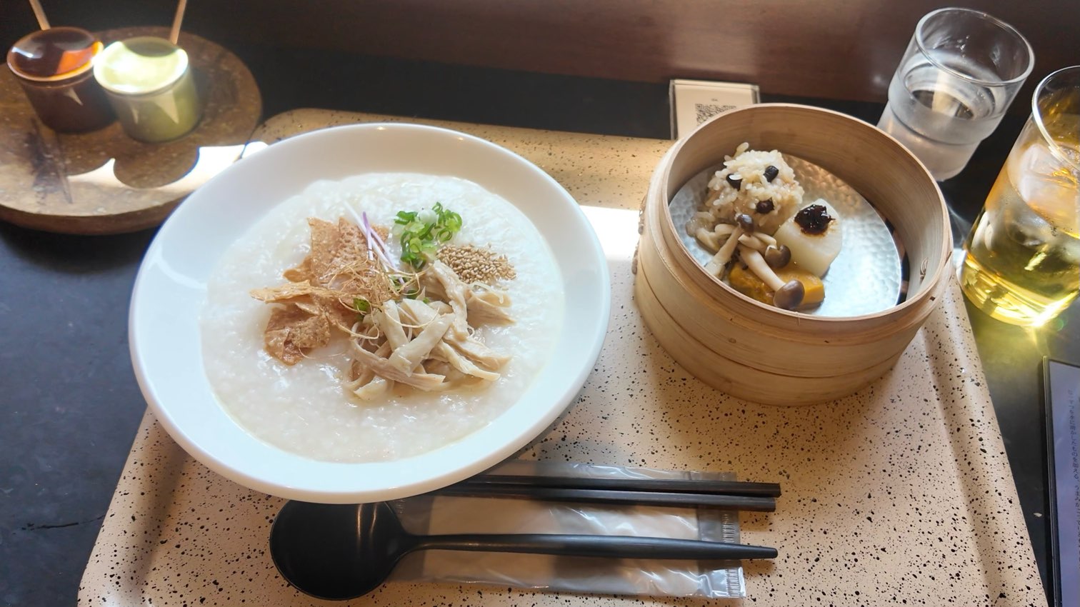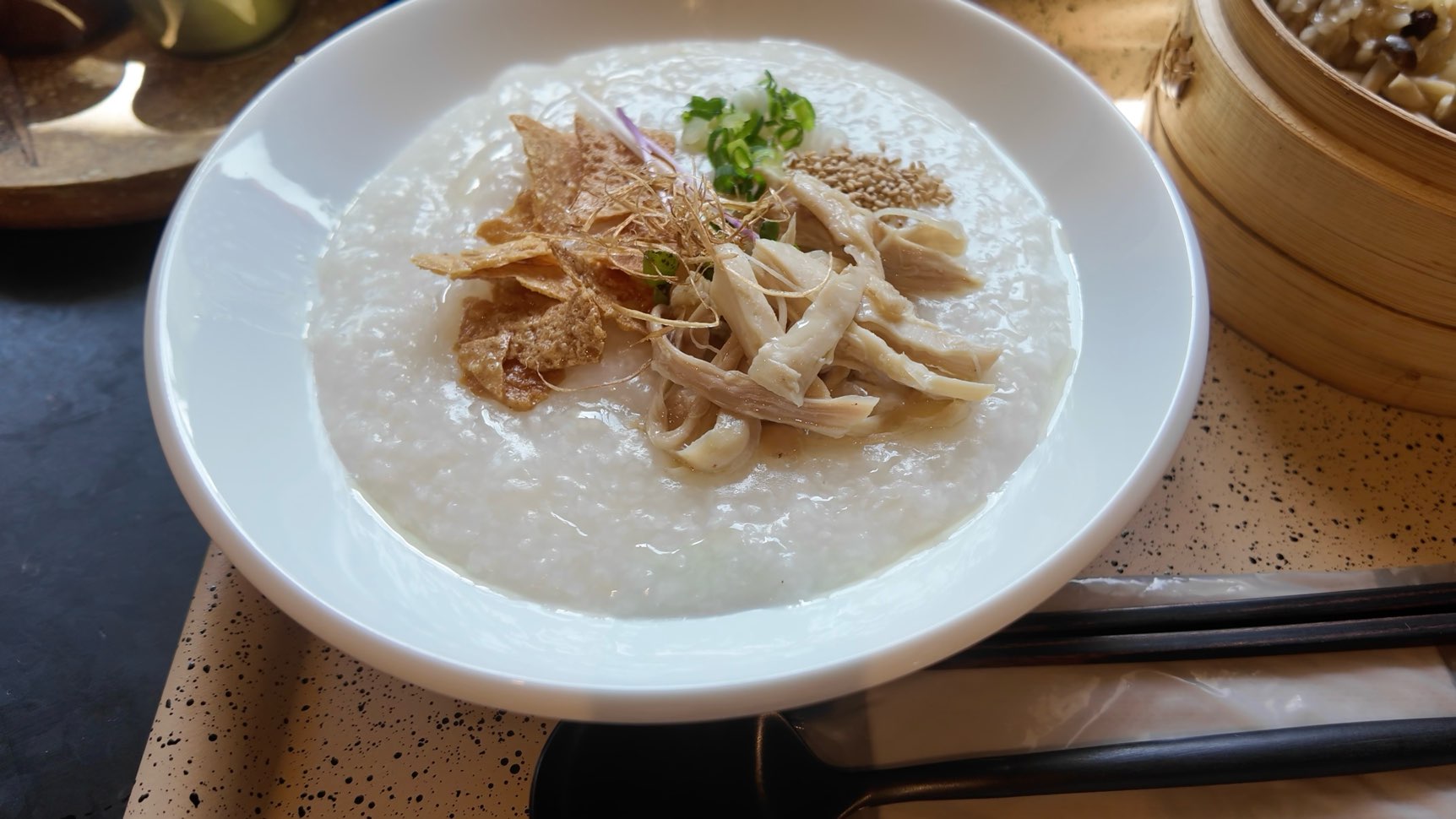 白くやわらかな湯気が立ちのぼるおかゆは、最初のひと口では“ほんのり薄味”に感じますが、上にのった鶏肉を合わせると印象が一変。
