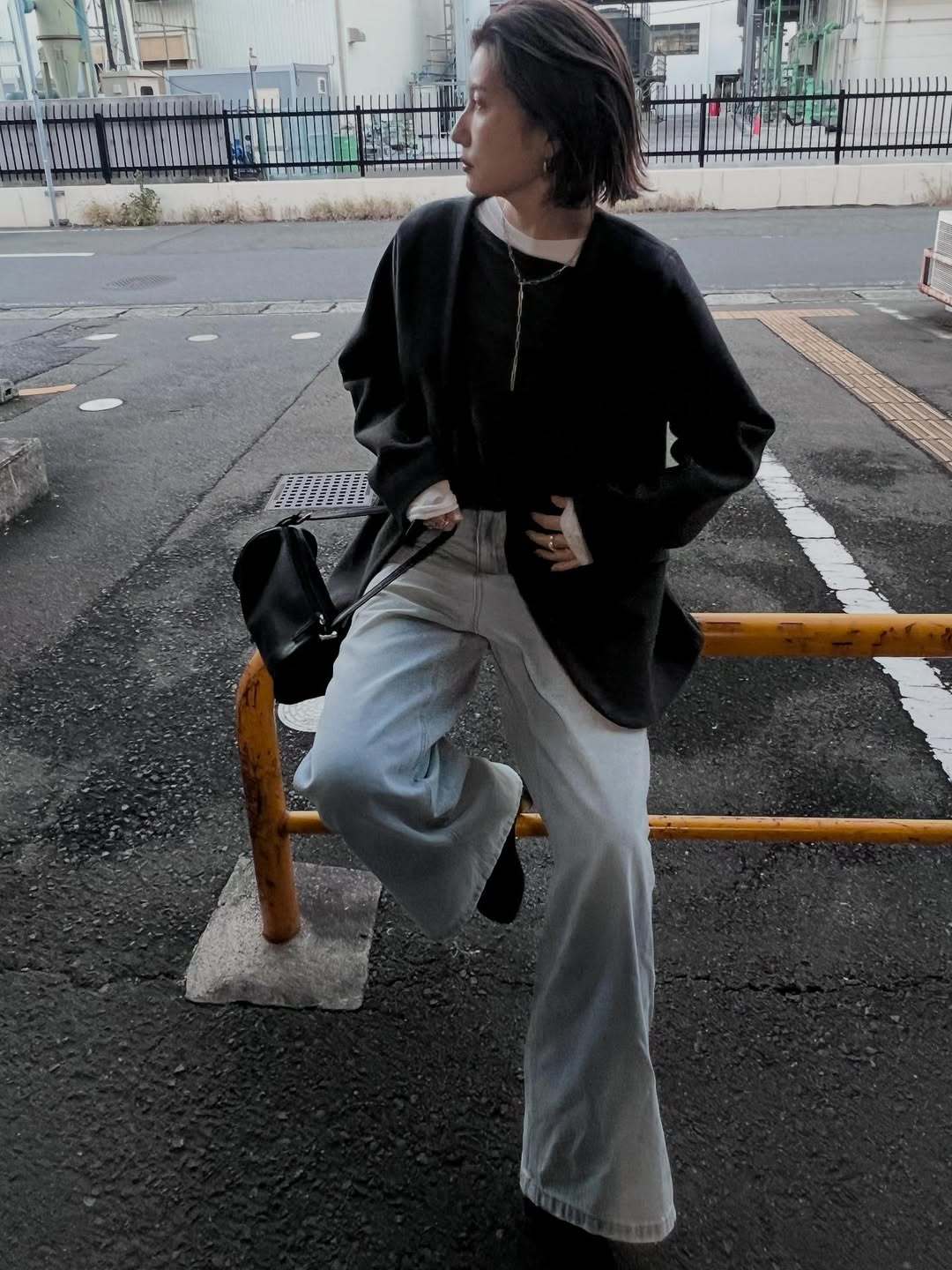 バッグや足元をブラックで引き締めることで、全体の印象にメリハリが生まれ、シンプルながらも洗練さも。