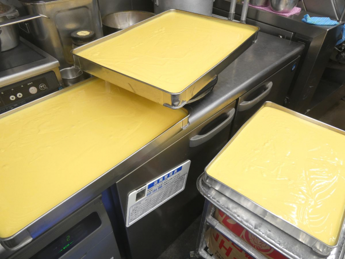 まずは「クリームパン」の要である“カスタードクリーム”を見せていただきました。昔は鍋に職人がつきっきりで作業されていたそうですが、今は味の安定化を図るため真空炊きという特殊な製造方法で作られています。そうすることにより、水分が逃げずあのなめらかなクリームが出来上がるそうです。