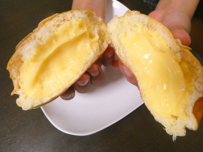 「しぼりたてクリームパン」は、通常の「クリームパン」に入っているカスタードクリームの1,5倍の量が入っていて、後からクリームを絞り入れている商品です。