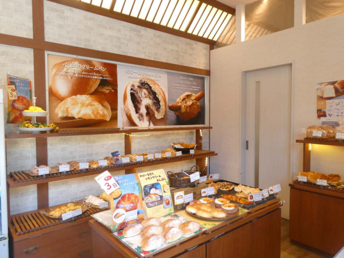 店内は大人気の「クリームパン」をはじめ「月替わりのクリームパン(8月:桃)」や夏野菜を使用した総菜パンなど様々な種類があります。