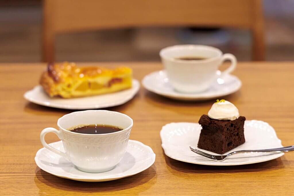 店内では多彩なコーヒーを楽しめるほか、ドリンクに追加できるケーキセットもあります。ガトーショコラ(+550円)とアップルパイ(+600円)。