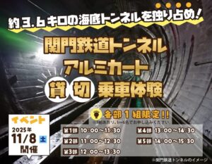 世界初の海底トンネルとして知られる関門鉄道トンネル。その全長約3.6kmのトンネルを、なんとアルミカートで独り占め走行できる特別体験が登場します!