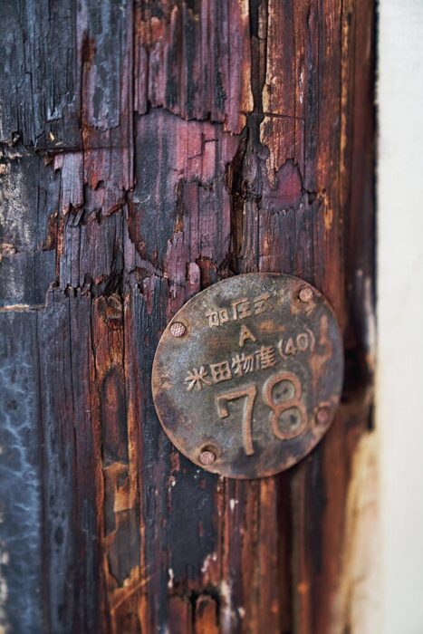 店作りのベースになっているのは木製の電柱。オーナーが集めたそうで、付いていたプレートもそのまま活かしている。
