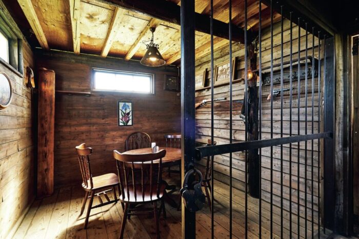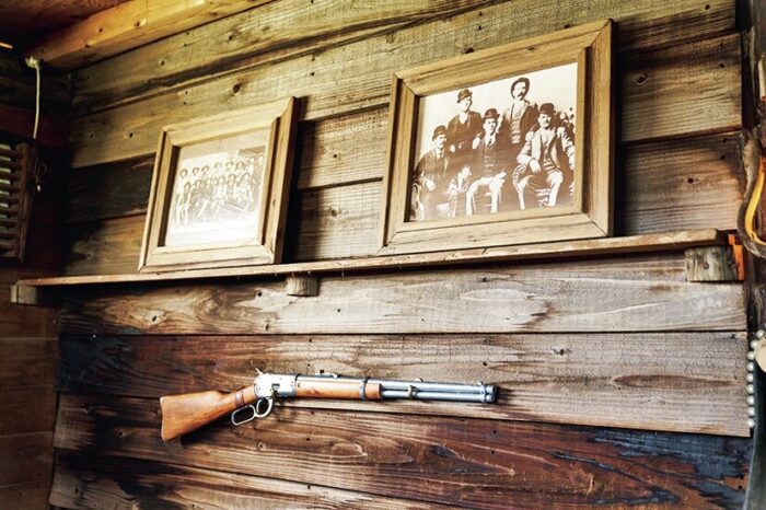 壁などにディスプレイされた銃やカウボーイハット、写真といったディスプレイやインテリアも雰囲気を演出している。