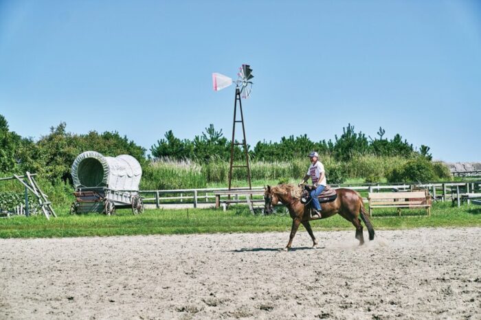 乗馬をする際には、ウエスタンサドルセットし、ウエスタンブーツを履くという本場のスタイルで。気分はまさにカウボーイ! アリーナで基本レッスンの他にもトレイルもできる外乗コースもある。ぜひお試しあれ!