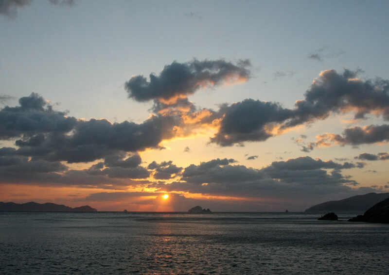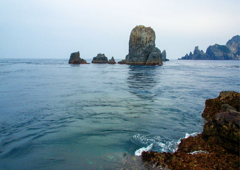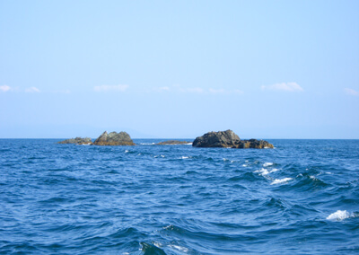 鵜来島から見た沖ノ島、栢島方面。カラス貝をエサに手持ちスタイルで行われていた釣りは、近年のライトなイシダイ釣りの原型かもしれない