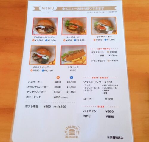 GOLDEN BURGERのメニューは全品テイクアウトOK。 料金もイートインと変わりません。 お得な学割の対象は大学生まで。 注文時「自分、学生です!」と伝えればポテトセットが100円引き。 ご店主が今後は学生向けのメニューも増やしていきたいと仰っていたので、学生さん期待できますよ! 大人も学生も、ぜひ行ってみてください。 ※記事公開後は込み合う場合がございます。できましたら、時間を空けての利用をお願いします。