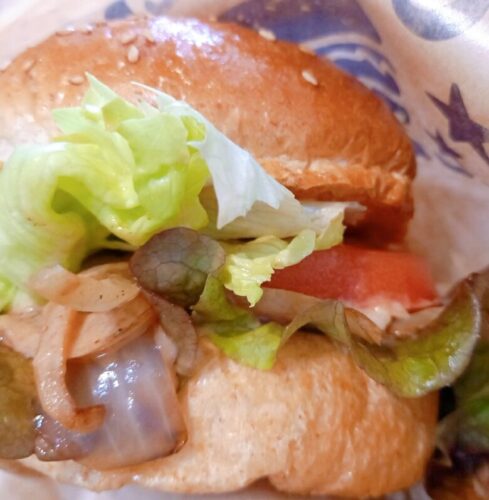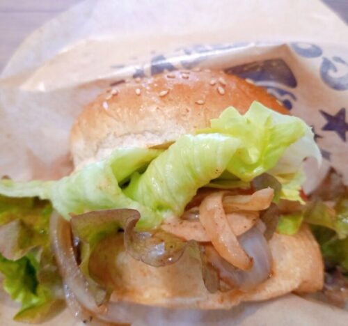 パティが埋もれるくらいたっぷりの玉ねぎソテーとレタス&トマト。