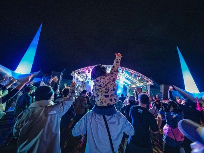 25周年を迎えた『朝霧JAM』では、場内を彩るデコレーションが一新されていました。メインステージであるRAINBOW STAGEはお馴染みの虹と雲をモチーフにした従来同様の装飾に見えましたが、その外周を囲うように何本もそびえ立つ角のような飾りがツートンカラーに生まれ変わり、夜の『朝霧JAM』に浮かび上がる演出に。