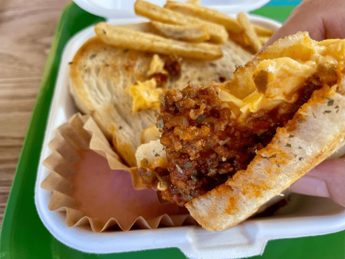 カリッと焼かれたパンに溢れんばかりの具。「スラッピージョーサンドイッチ」は、具がこぼれてだらしない(sloppy)ことに由来しているそうなので、溢れる具を気にせずわんぱくにいただきましょう。