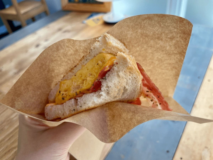 卵たっぷり2個分にはみ出すベーコンが豪快な「ベーコンエッグチーズサンドイッチ」は、卵のまろやかな風味がよりしっかりと感じられます。