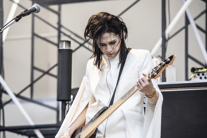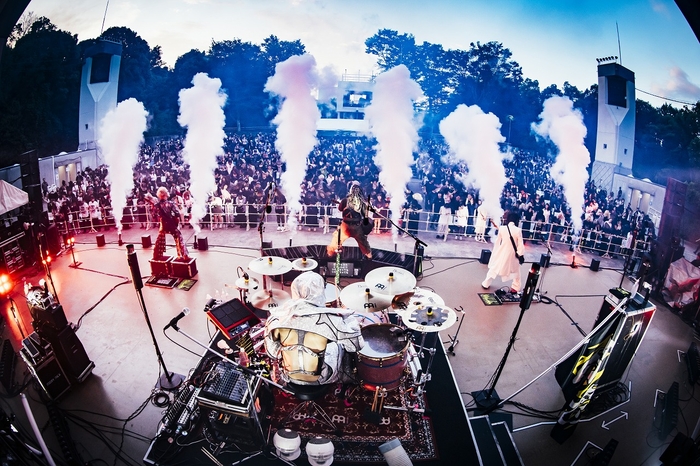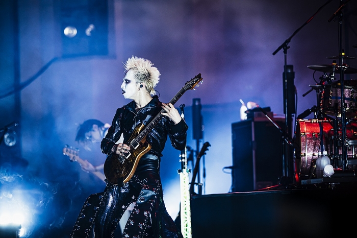 開演定刻の午後6時を4分ほど過ぎた頃、BGMの音量が上がり、当然のようにまだ明るい空の下、客席を埋め尽くした群衆は臨戦態勢を整える。赤い照明が点滅し、ステージの前線では8基のスパークラーから火花が噴出。オープニングSEに乗って次々とステージ上に姿を現したメンバーたちは見慣れない新衣装をまとっている。貴公子然とした純白のコスチュームに身を包んだユエ(Ba)の姿以外には、例によって一言では形容しがたいものがある。