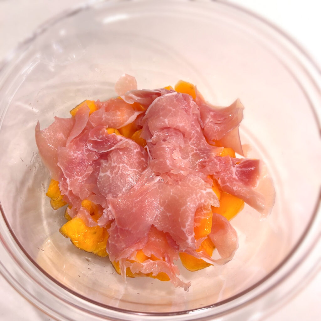 ② 生ハムは1枚を3、4等分くらいに手でちぎります。