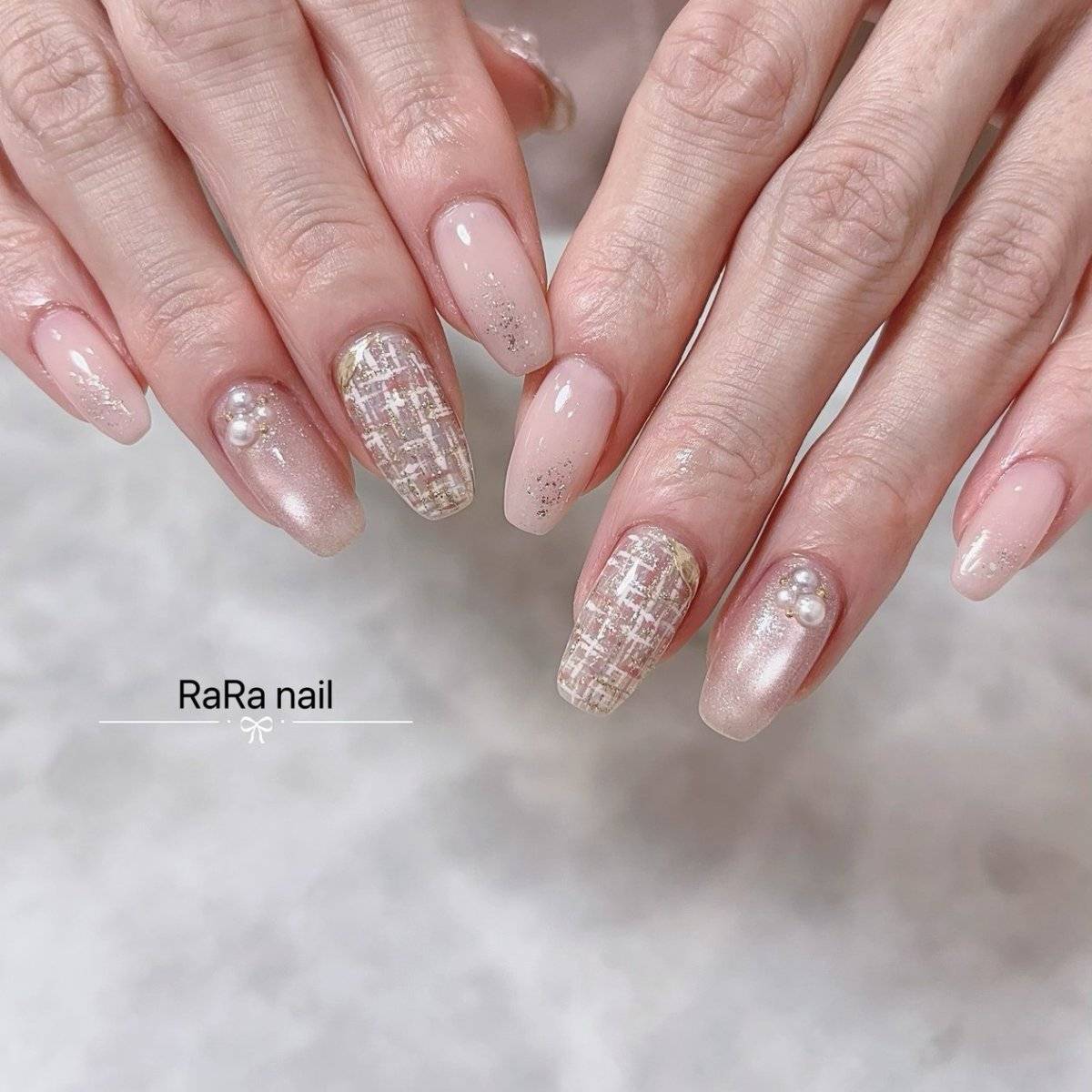 可愛らしさや柔らかさに落ち着きが加わり、大人のためのキラキラネイルが完成します。